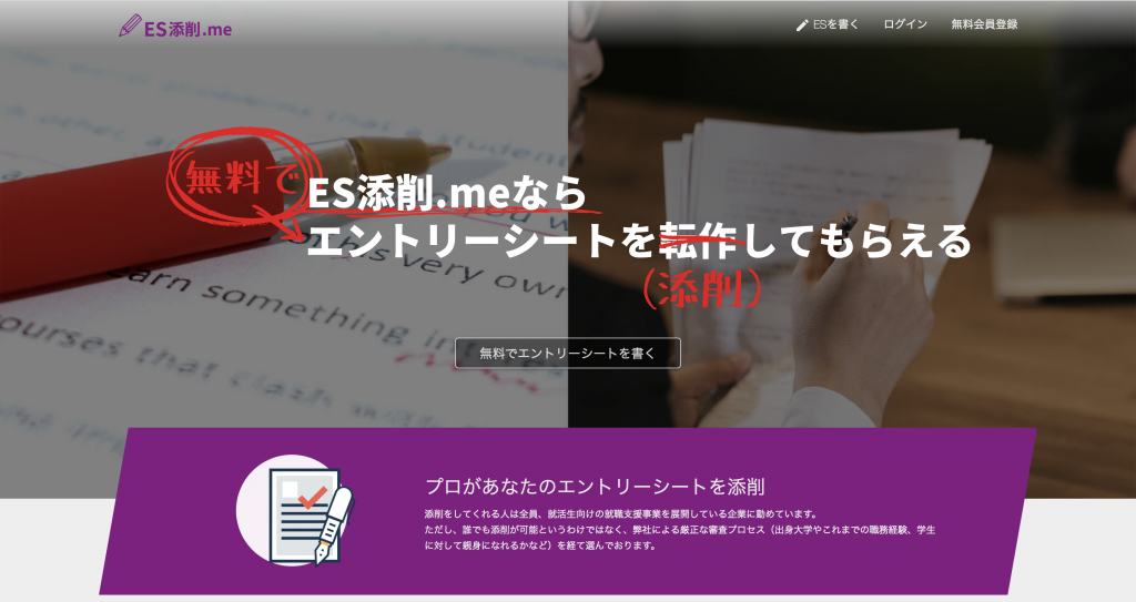 ES添削.meは就活生向けの就活支援サービスに関する企業に勤めている社員が就活生のESを無料で添削してくれるというサービスです。