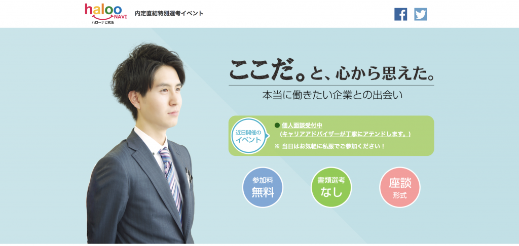 ハローナビは座談形式・参加費無料で企業の採用・人事担当者に対して就活に関する質問をすることができるという就活支援サービスです。企業担当者と少人数のグループで企業についての質疑が行えたり、マンツーマンの面談を行うことができます。また企業と就活生の間にはハローナビのアドバイザーが仲介を行い、就活に関する相談を受け付けてくれています。こちらも座談会などに参加するには東京を中心としたハローナビの会場に行く必要がありますが、先ほど紹介したアドバイザーに相談をするということだけならばLineやSkypeなどで行うことができます。直接会場に行けない人はES添削もそちらの方で行うと良いでしょう。